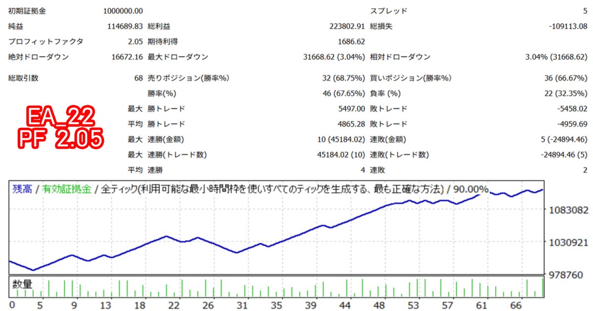 直近の相場に最適化する様に期間が3カ月と短く取引回数も少ないのですが、期間5年回数1000回以上で優位性のあるEAが作成できるのか挑戦していきたいです。今後もよろしくお願いいたします。