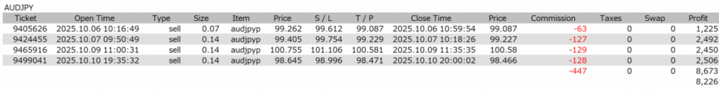 【FX自動売買運用結果】2025年10月6日週 オージー円 #5 プラス8,226円 2025 10/24 検証&実運用 2025年10月12日2025年10月24日 目次今週のFX自動売買やってみたの結果#5 結果まとめ 通貨ペア:オージー円期間:5分足(M5) 2025年10月06日~2025年10月10日トレード回数:4回勝敗:4勝0敗損益:+8,226円 振り返り 全勝なのはすごい 検証&実運用 よかったらシェアしてね! URLをコピーしました! URLをコピーしました! 【FX自動売買運用結果】2025年10月6日週 ユーロ円#4 プラス6,706円 EAリアルトレード振り返り(2025/09/09–10/10)月利 +2.24% この記事を書いた人 yasu_n@kao_d7 関連記事 【FX自動売買運用結果】2025年10月20日週 -12,096円 2025年10月25日 【FX自動売買運用結果】2025年10月13日週 オージー円 プラス4,250円 2025年10月18日 【FX自動売買運用結果】2025年10月13日週 ユーロ円 マイナス12,217円 2025年10月18日 【FX自動売買運用結果】2025年10月13日週 ドル円 プラス7,050円 2025年10月18日 EAリアルトレード振り返り(2025/09/09–10/10)月利 +2.24% 2025年10月12日 【FX自動売買運用結果】2025年10月6日週 ユーロ円#4 プラス6,706円 2025年10月12日 【FX自動売買運用結果】2025年10月6日週 ドル円#3 マイナス10,321円 2025年10月12日 【FX自動売買バックテスト結果】EA_22 オージー円 2025年10月7日 コメント コメントする コメントをキャンセルコメント ※ 名前 ※ メール ※ サイト 次回のコメントで使用するためブラウザーに自分の名前、メールアドレス、サイトを保存する。